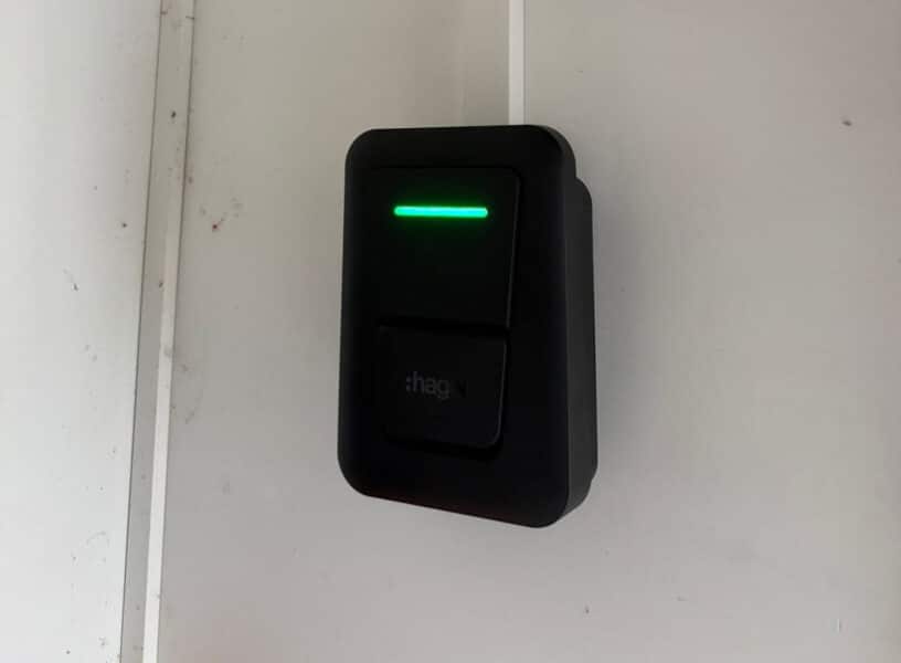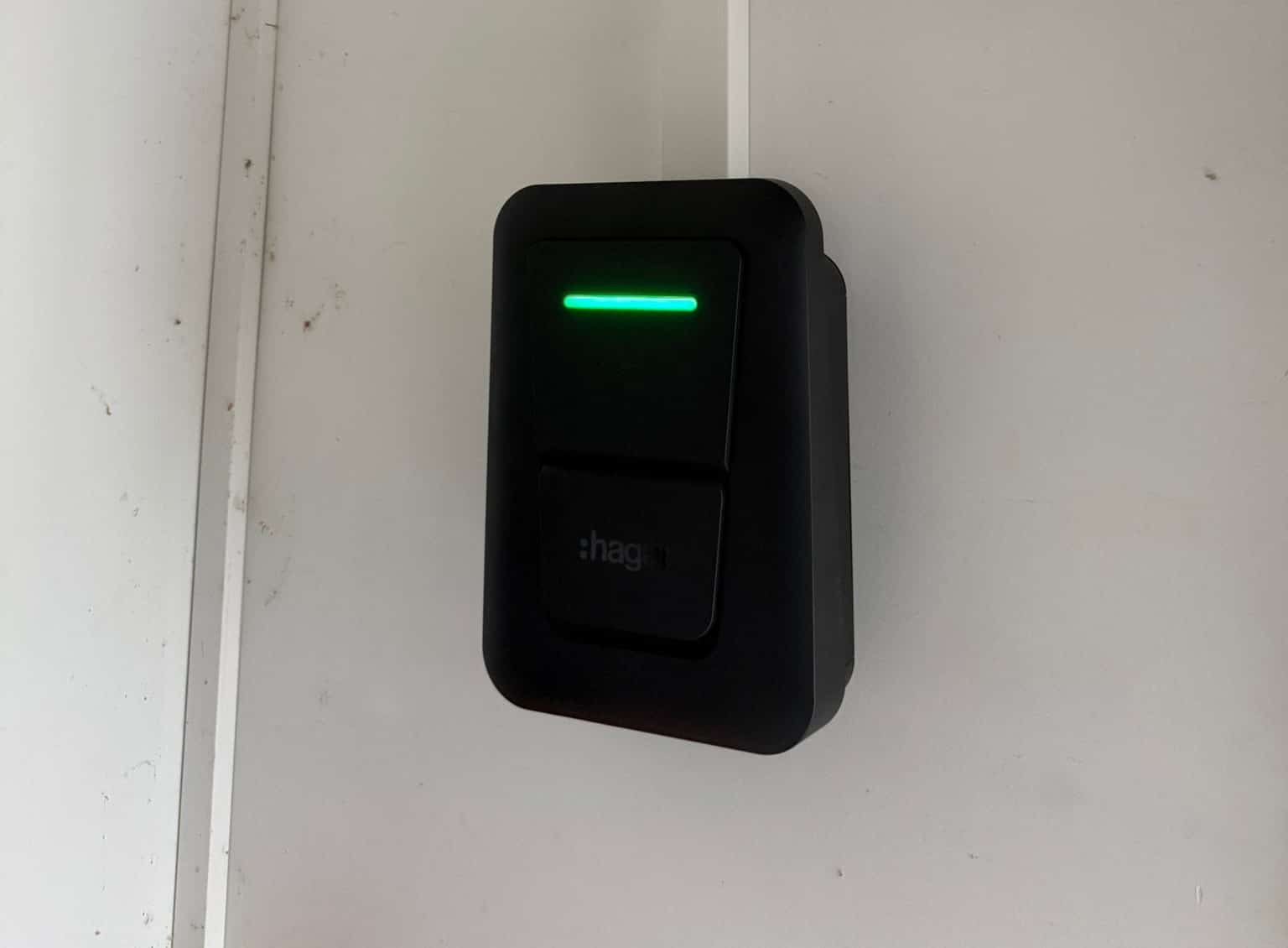 Compacte et murale, cette borne Hager affiche un voyant LED vert signalant son bon fonctionnement, avec connecteur Type 2 standard pour une recharge monophasée rapide adaptée aux trajets quotidiens.