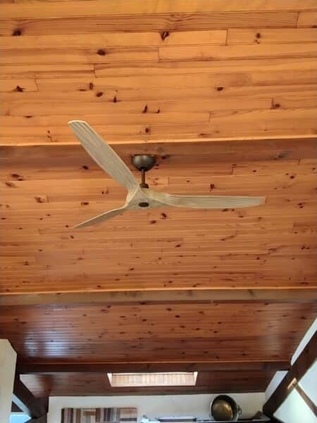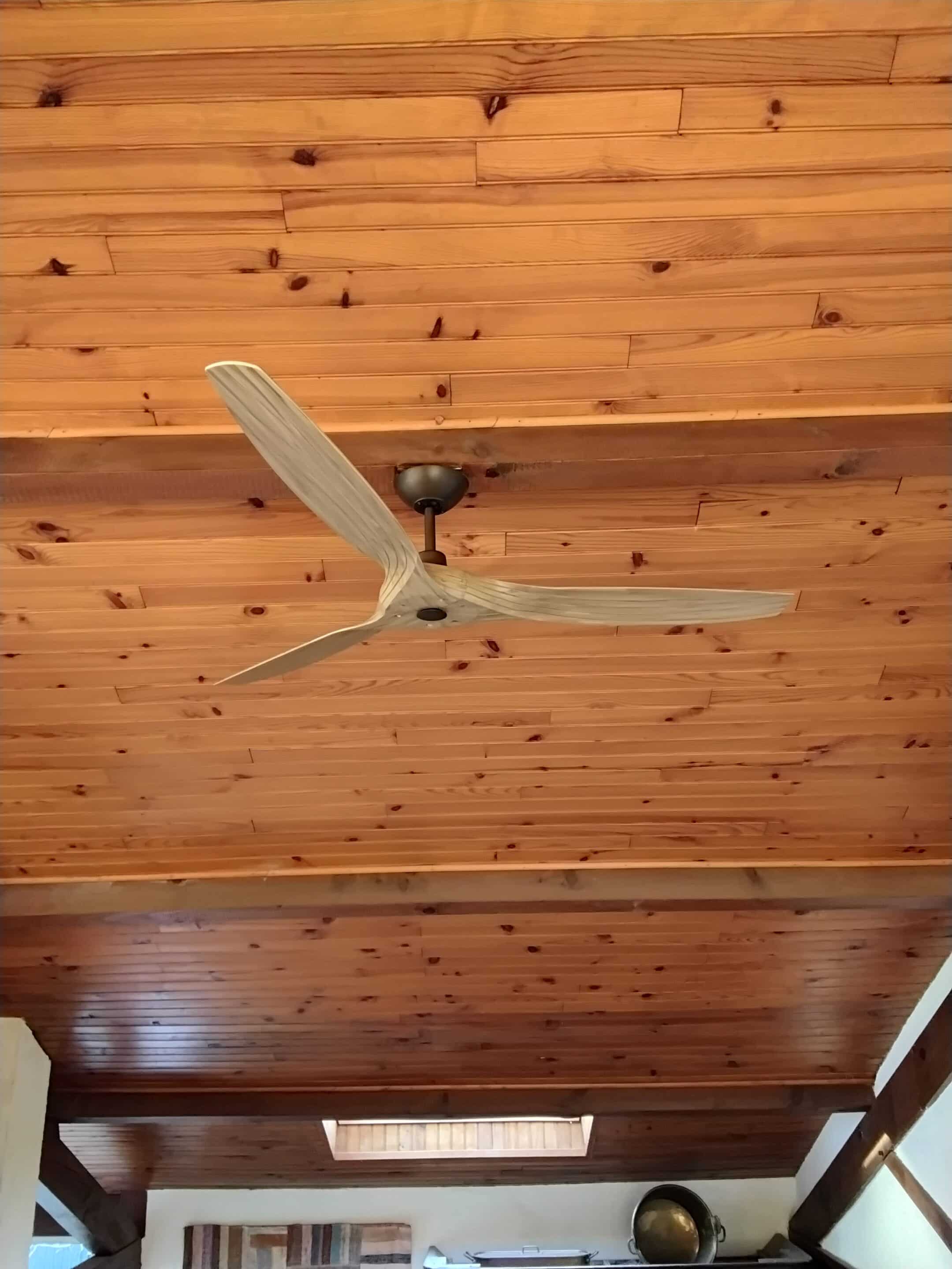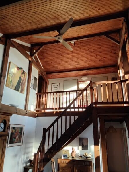 Le système est conçu pour renvoyer doucement l’air chaud accumulé au plafond vers le bas. Cela permet de créer une température plus homogène dans toute la pièce, de la mezzanine jusqu’au rez-de-chaussée.